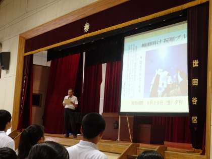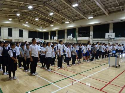 本日、全校朝礼を行いました。校長先生から新聞記事のスライドを見せながら、これからの未来に向けて持続可能な開発を続けていけるようにするために必要なことについてお話がありました。(遠藤)