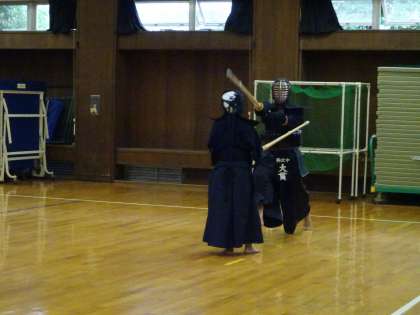 格技室では剣道部が活動しています。肩や腕に余計な力が入らないように正しい打ち方を身につけましょう(遠藤)