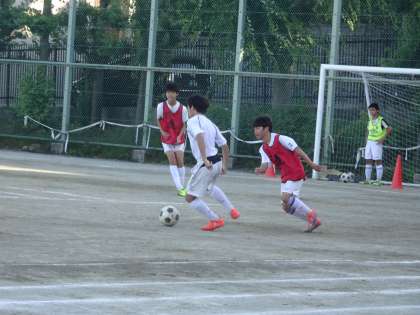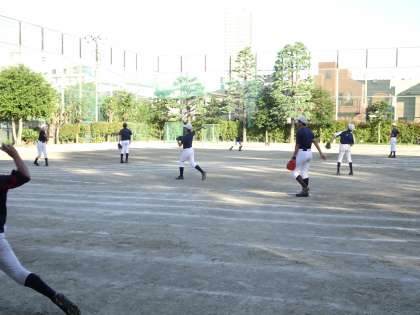 校庭を二つに分けてサッカー部と野球部が活動しています。(遠藤)