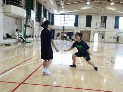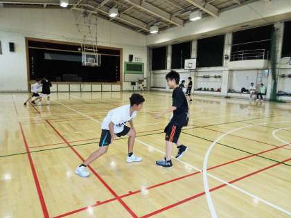 体育館ではバスケットボール部が活動しています。1対1で相手のコースに入る練習をしていました。サイドステップで相手のコースに入ることはディフェンスの一番大切なことです。きちんと身につけましょう。(遠藤)