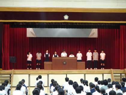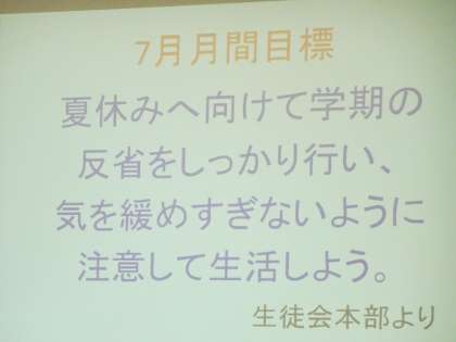 本日、生徒会朝礼を行いました。生徒会本部や各専門委員会から報告や生徒へのお願いが伝えられました。SNSルールについては家庭でもきちんと確認しておきましょう。(遠藤)
