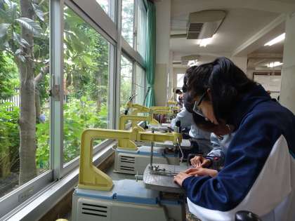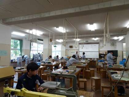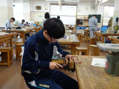 3年生の技術の授業の様子です。電動のこぎりや糸のこぎりで金属の板を切っています。(遠藤)
