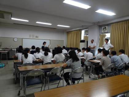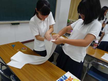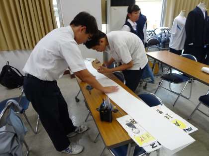 放課後、選挙管理委員会が行われました。生徒会本部役員選挙の立候補が締め切られました。2年生4名、1年生3名の計7名の立候補者とその応援者が集まり、選挙運動で使用するたすきを作っていました。(遠藤)