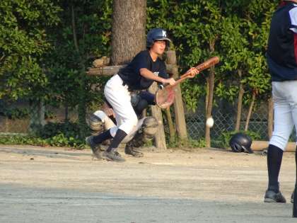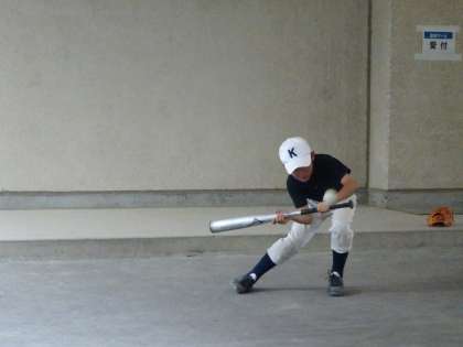 校庭では野球部が活動しいています。バント練習をしています。膝を使って高さを変え、バットのヘッドが下げないようにしましょう。(遠藤)