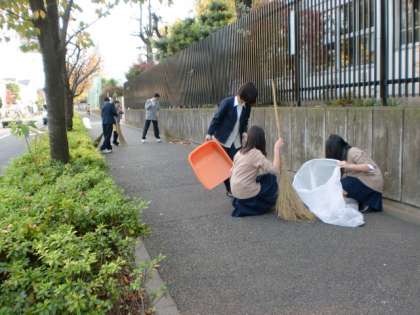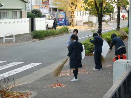 落ち葉掃きが続いています。昨日は三年生が大々的に、今日は2年生の委員が落ち葉掃きをしました。木々の紅葉もだいぶ落ちて少なくなってきました。今年の落ち葉掃きももうすぐ終わりそうです。そうすると本格的な冬の到来です。友達と笑いながら、朱や黄に染まった木の葉を掃いている情景は、意外に懐かしい中学生時代の思い出のシーンになるような気がします。