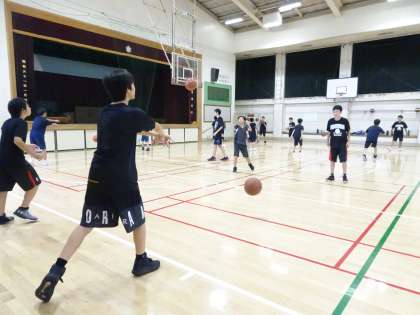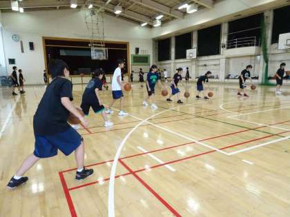 体育館ではバスケットボール部が活動しています。男子はパス練習、女子はドリブルの練習をしていました。(遠藤)