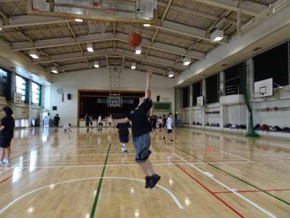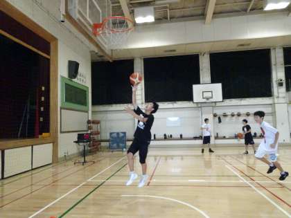 体育館では午後からバスケットボール部が活動しています。レイアップシュートの練習です。ノーマークなら確実にシュートを決められるようにしましょう。(遠藤)
