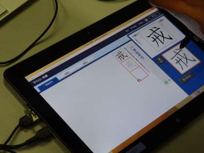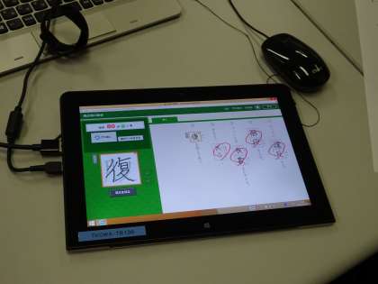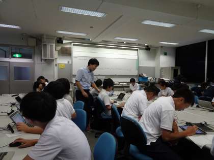 1年生の夏休みの補習が行われています。パソコン室で『e-ラーニング』を使い、お手本を見ながら漢字を書いたり、漢字ドリルをしたりしています。(遠藤)