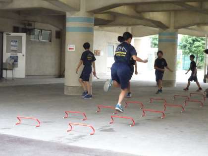 陸上競技部がプール下で活動しています。ミニハードルを使ってトレーニングをしていました。(遠藤)