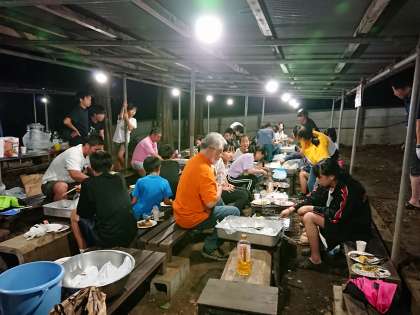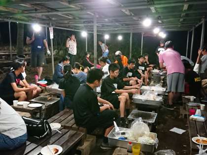 夕食はバーベキューです。明日の朝からの練習に備えて、たっぷりエネルギー補給をしています。(遠藤)