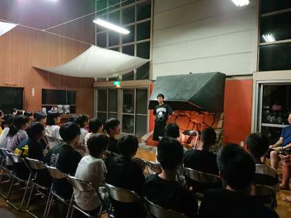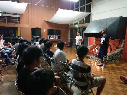 初日の最後はミーティングです。一人ひとり目標を発表しました。その後、部長団から明日の練習に向けて話がありました。明日は朝から練習です。今日はきちんと休んで明日に備えましょう。(遠藤)