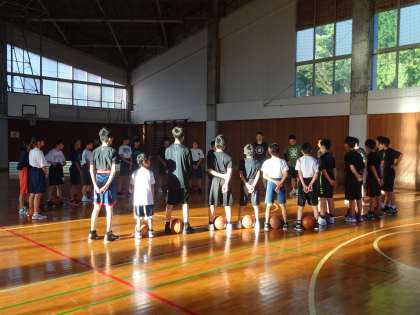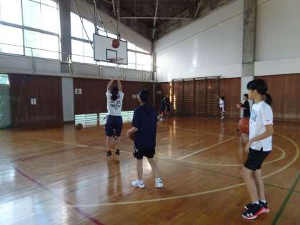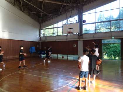 合宿二日目。朝6時から朝練習が始まります。シュート練習をしています。正しいフォームを意識してシュートを打ちましょう。(遠藤)
