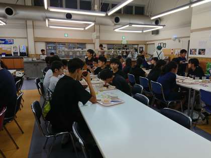 午後の練習のあとは楽しい夕食です。たくさん練習したので、たくさん食べて体力を回復させましょう。(遠藤)