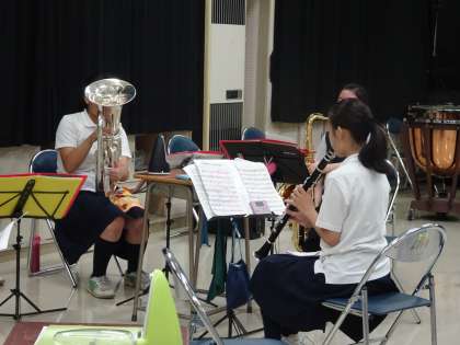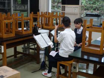 吹奏楽部は音楽発表会に向けて練習を再開しています。先輩が後輩にアドバイスをしながらパートごとに練習をしていました。(遠藤)