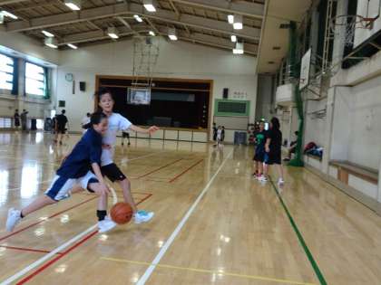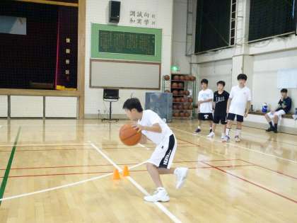 午後の体育館ではバスケットボール部が活動しています。女子は1対1のディフェンス練習、男子は45度のミートからのドライブ練習をしていました。(遠藤)