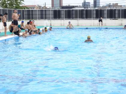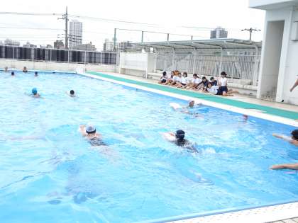 1年生の体育の授業の様子です。男子はクロールや平泳ぎの25mのタイムを計っていました。女子はビート板を使って泳いでいます。(遠藤)