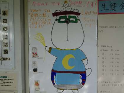 生徒会掲示板のくまざわくんのデザインがリニューアルされました。今回のテーマは「お月見」です。(遠藤)