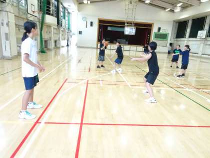 午前中の体育館では女子バスケットボール部が活動しています。レイアップシュートやディフェンスの位置を確認していました。ボールマンからの距離でディフェンスのつき方が変わるのできちんと覚えましょう。(遠藤)
