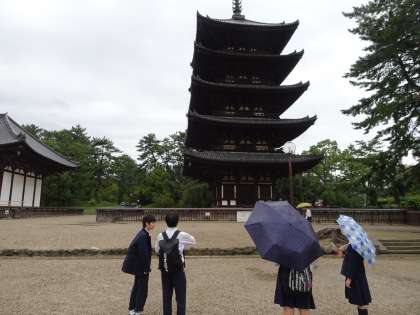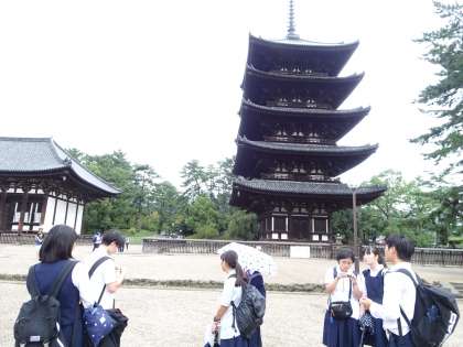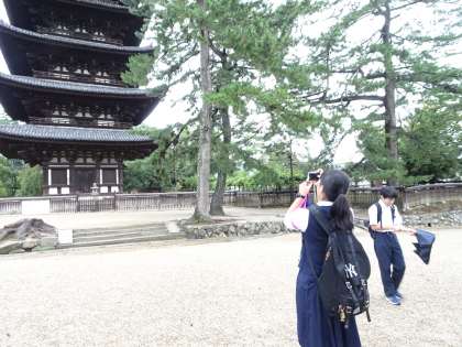 班別行動で興福寺を見学しています。五重の塔の写真、上手く撮れていますか?(遠藤)