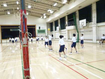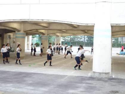 1年生の体育の授業です。男子は体育館でバレーボール、女子はプール下でソフトボールをやっています。(遠藤)