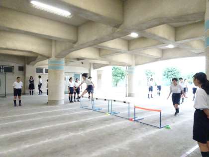 3年生の体育の授業の様子です。男子は体育館でバスケットボール、女子はプール下でハードルをやっていました。(遠藤)