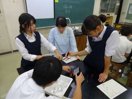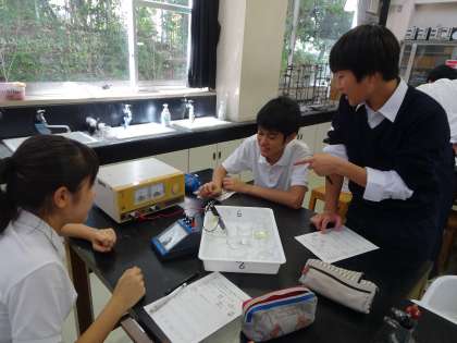 3年生の理科の授業です。いろいろな水溶液に電流を流す実験を行っていました。実験の考察をしっかりと書きましょう。(遠藤)