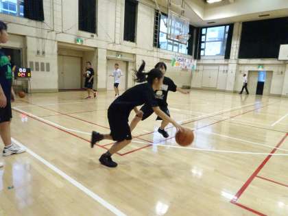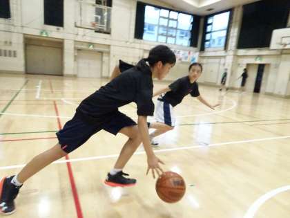 女子バスケットボール部が体育館で活動中です。1対1をやっていました。フェイクをいれてマークマンをずらして、速く低いドリブルで抜いていきましょう。(遠藤)