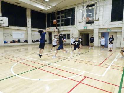 女子バスケットボール部が体育館で活動しています。3対2のアウトナンバーでの攻め方、守り方の練習をしていました。(遠藤)