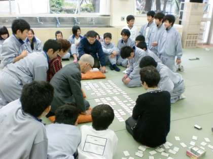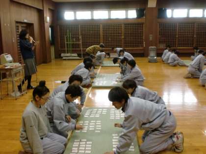 2年生は1月14日(金)、1年生は土曜授業日の1月15日(土)に百人一首大会があります。国語科の授業でもあり、「美しい日本語週間」にちなんだ行事でもあります。今日の2.3.4校時に、地域の百人一首の会「八重垣会」の皆さん6名にご来校いただき、指導していただきました。上の句だけで次々と札をとられ、その熟練の技に生徒もびっくりしていました。きっと、冬休みに句を覚えようとする生徒が倍増したのではないかと思います。大会当日にも来ていただくことになっています。3時間もご指導いただきありがとうございました。