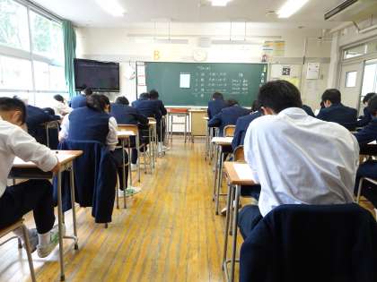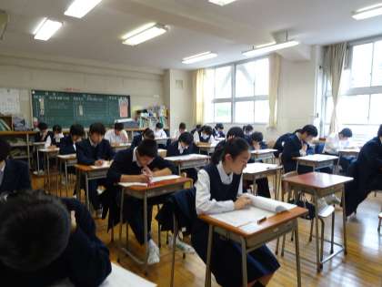 本日、3年生は学習習得確認調査を行っています。みんな集中して問題に取り組んでいます。今の自分の力を知るよい機会です。がんばりましょう。(遠藤)