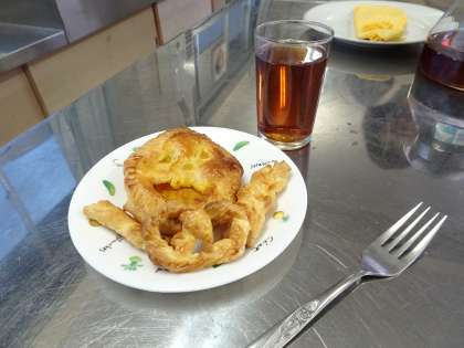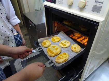 今日の家庭科部はパンプキンパイを作っています。オーブンから取り出したパイからはこんがりと焼けたいい匂いがします。おいしくできましたね。(遠藤)