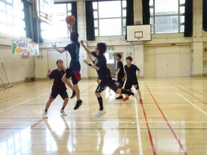午後の体育館では男子バスケットボール部が活動しています。3対3をやっています。ディフェンスは常にカバーに行くことを意識していましょう。(遠藤)