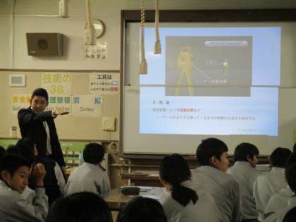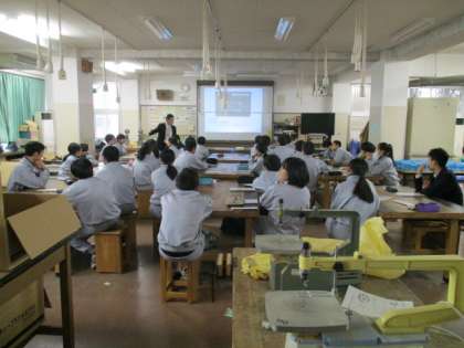 本日は高校の先生方がいらしてくださり、2年生の各クラスを授業してくださいました。写真は2年A組、工業(機械)の授業です。都立六郷工科高等学校の先生が授業してくださいました。