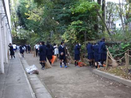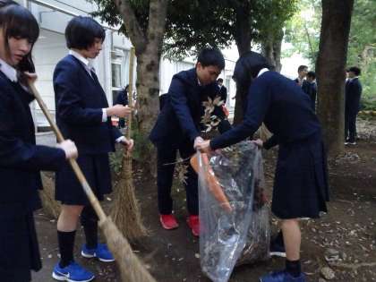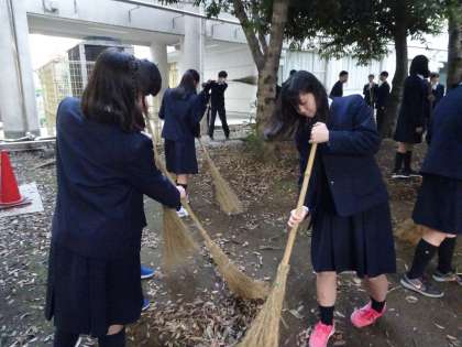 放課後、美化委員会主催の落ち葉はきが行われました。今日の担当は3年生です。多くの生徒がボランティアとして手伝ってくれたので、タンチ山がとてもきれいになりました。(遠藤)
