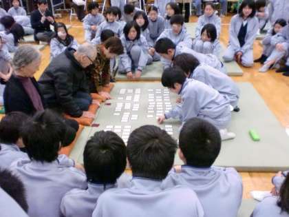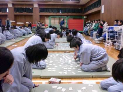 今日は、学校公開週間の土曜授業日です。たくさんの皆様のご来校ありがとうございました。一年生は2、3校時に百人一首大会を開催しました。たくさんの保護者の皆さんが参観される中、大変盛り上がりました。保護者の皆様のアンケートでも、「楽しく真剣に取り組んでいた」「土曜日なので百人一首大会をはじめてみられてよかった」等のコメントをいただきました。今日も八重垣会の皆さんに来ていただきました。一番年上の方は、なんと96歳でいらっしゃるそうです。12月から何度もご来校いただき、ありがとうございました。なお、今日の大会では、1年B組が優勝しました。