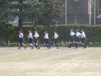 1年生の体育の授業です。1500mのタイムを計測しています。(遠藤)