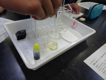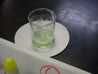 3年生の理科の様子です。理科室で中和の実験です。酸性の水溶液にBTB溶液を入れて、黄色から緑色に変わるまでアルカリ性の水溶液を一滴ずついれています。(遠藤)