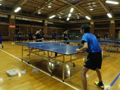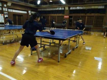 格技室では卓球部が活動中です。3球目攻撃の練習をしています。(遠藤)