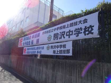 世田谷区立中学校陸上競技大会総合準優勝と陸上競技部の関東大会4位の横断幕が設置されました。(遠藤)
