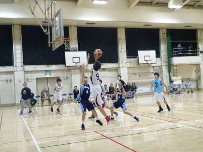 男子バスケットボール部が体育館松沢中で練習試合を行っています。コート内でプレーしている人たちがお互いに声を掛け合ってディフェンスをしていきましょう。(遠藤)