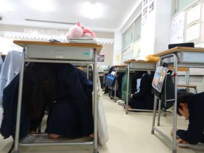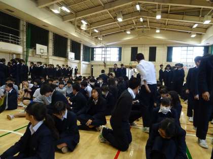 本日、避難訓練を行いました。地震を想定し、生徒への予告なしで訓練を行いました。放送が入ると生徒たちは速やかに机の下に入り、その後、先生の指示に従って体育館へ避難しました。集まってからは私語をせずに整列をしましょう。(遠藤)