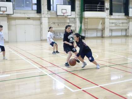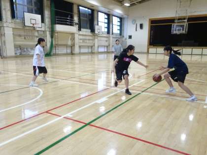 午後の体育館では女子バスケットボール部が活動しています。スクリーンプレーの練習や2対2をしていました。(遠藤)