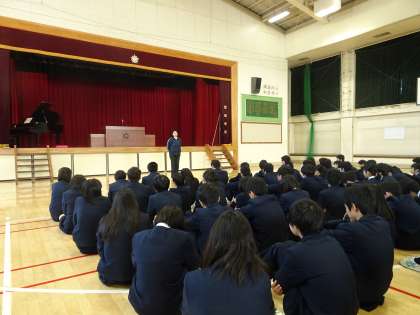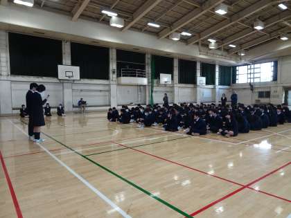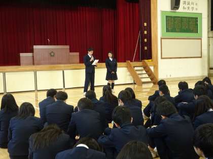 3年生の学年集会の様子です。各クラスの学級委員からクラスの2学期のふり返りが伝えられました。できていなかった点は3学期には改善できるようにしましょう。(遠藤)