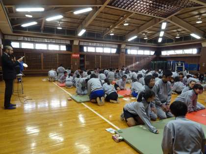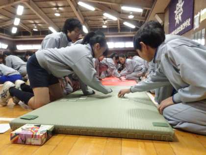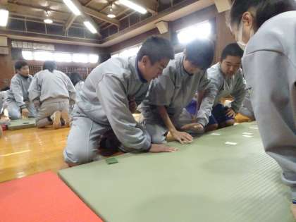 2年生の百人一首大会が行われています。学年の先生が読み手をしています。1位をめざしてがんばりましょう。(遠藤)