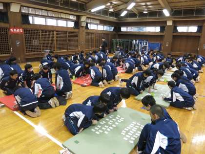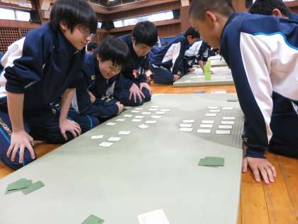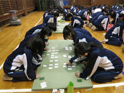 1年生の百人一首大会が行われています。みんな集中して読み手の声を聴いています。1枚でも多く取れるようにがんばりましょう。(遠藤)