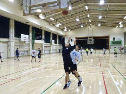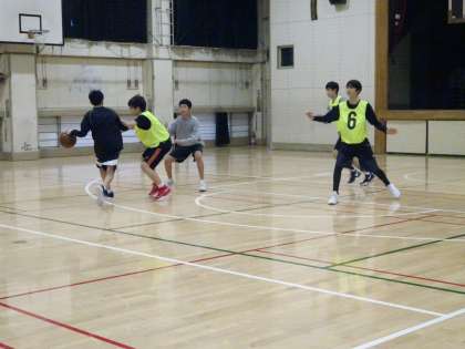 体育館ではバスケットボール部が活動しています。男子は3体3、女子は1対1をやっています。(遠藤)