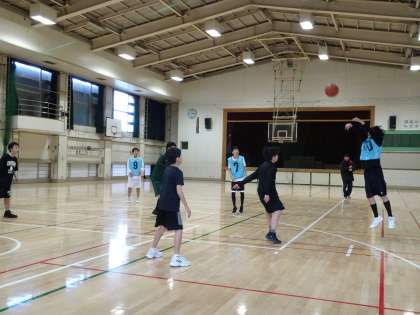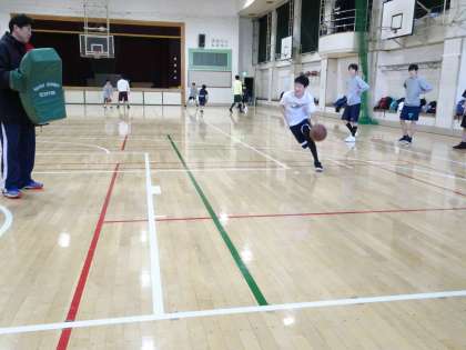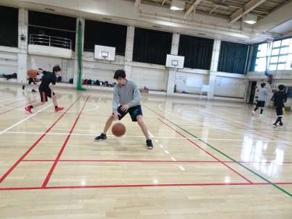 午後の体育館では男子バスケットボール部が活動中です。ドリブル練習や5対5のゲーム形式の練習をしています。(遠藤)