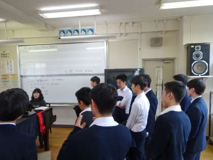 昼休みの歌練習の様子です。今日は3年CD組の男子です。音程も覚え、少しずつ声も出るようになってきました。(遠藤)