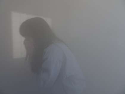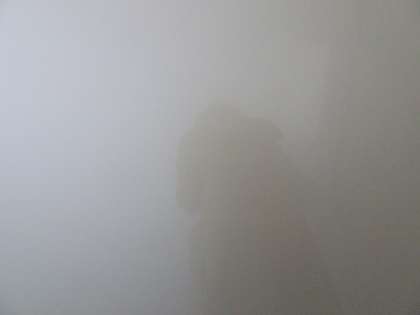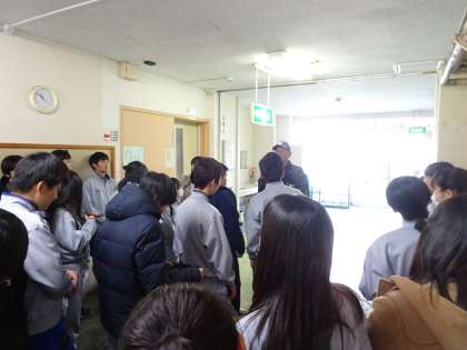 煙中避難訓練の様子です。視界が2mくらいしかない中を避難しています。(遠藤)