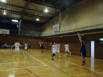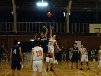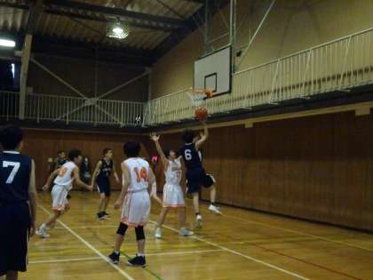 男子バスケットボール部が練習試合を行っています。対戦校は狛江三中です。試合の中で、互いに声をかけあって自分たちで考えてプレーしましょう。(遠藤)